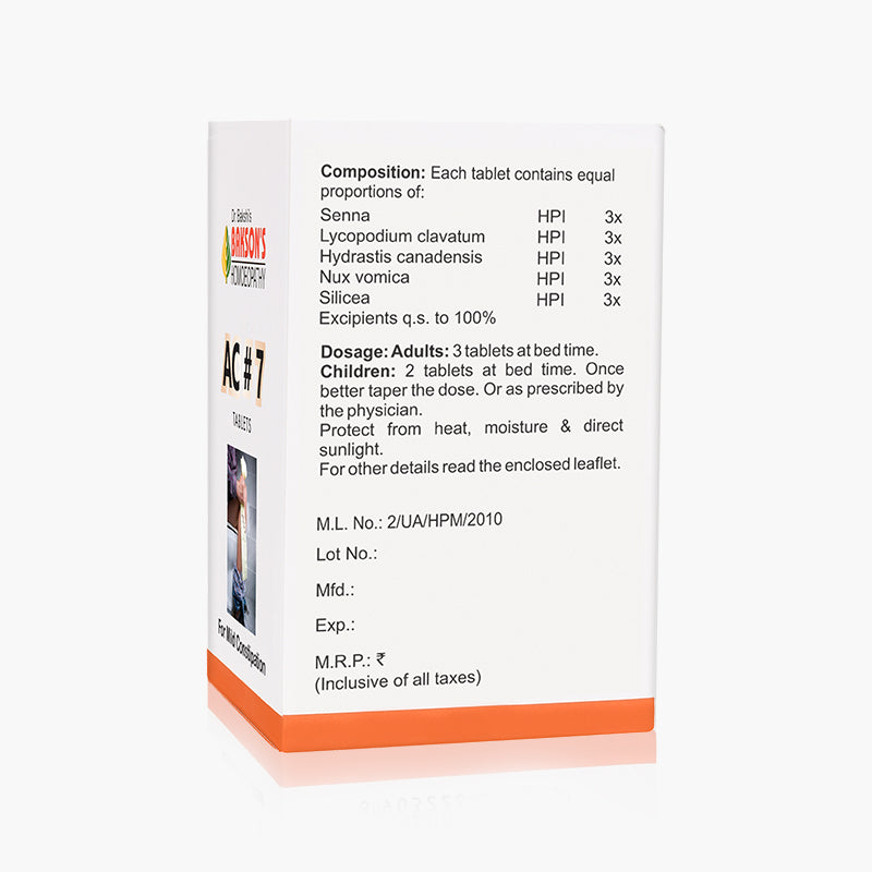AC#7 is a homoeopathic combination which relieves mild constipation without side effects.