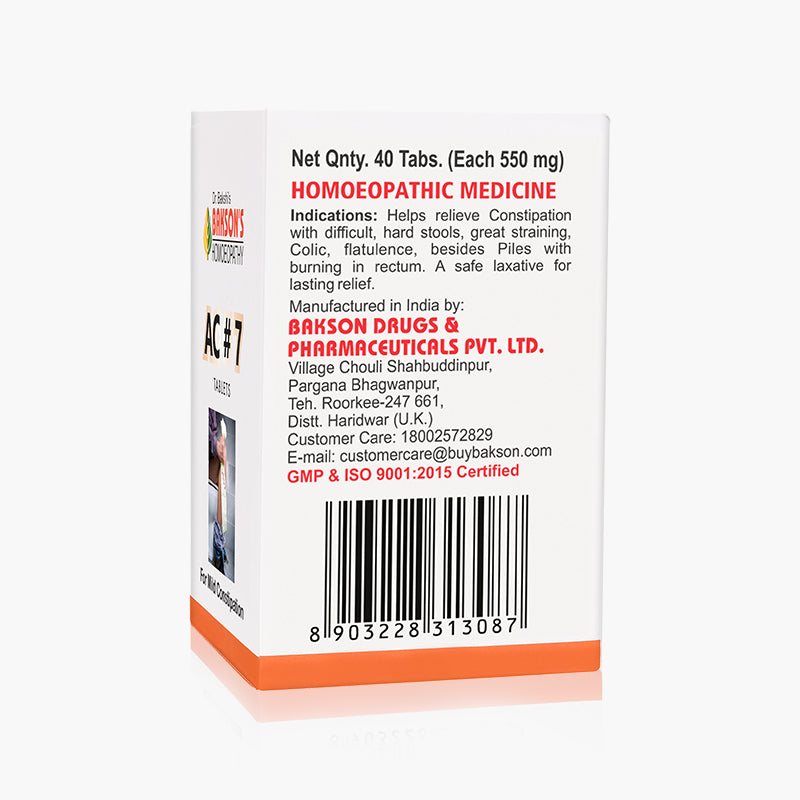 Bakson's Homoeopathy introduces a safe and effective formulation in the form of AC#7 to assist regular bowel movements, ease evacuation without side effects or dependency. AC#7 is a mild laxative, safe for longer use if required. It has the following ingredients: