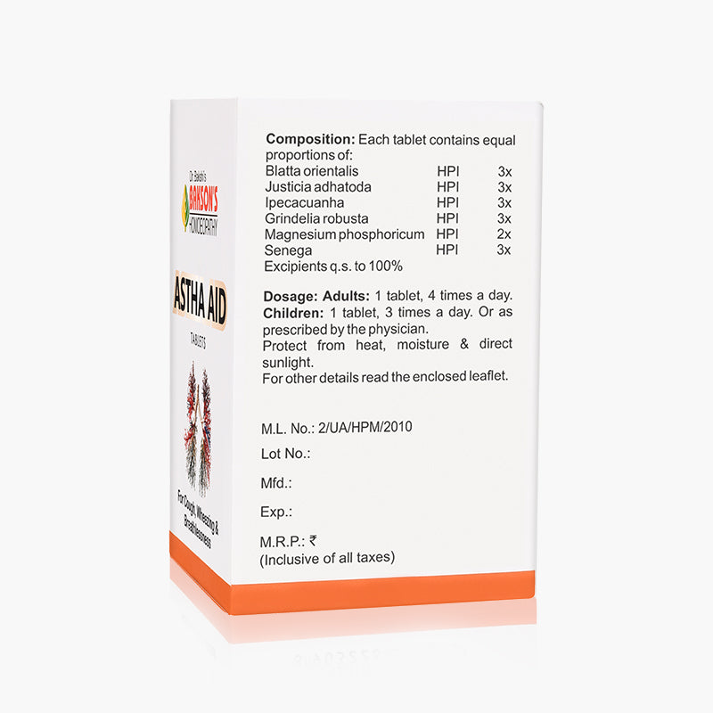 ASTHA AID TABLET act in three ways : as bronchodilator, a decongestant and it reactivates one’s vitality.