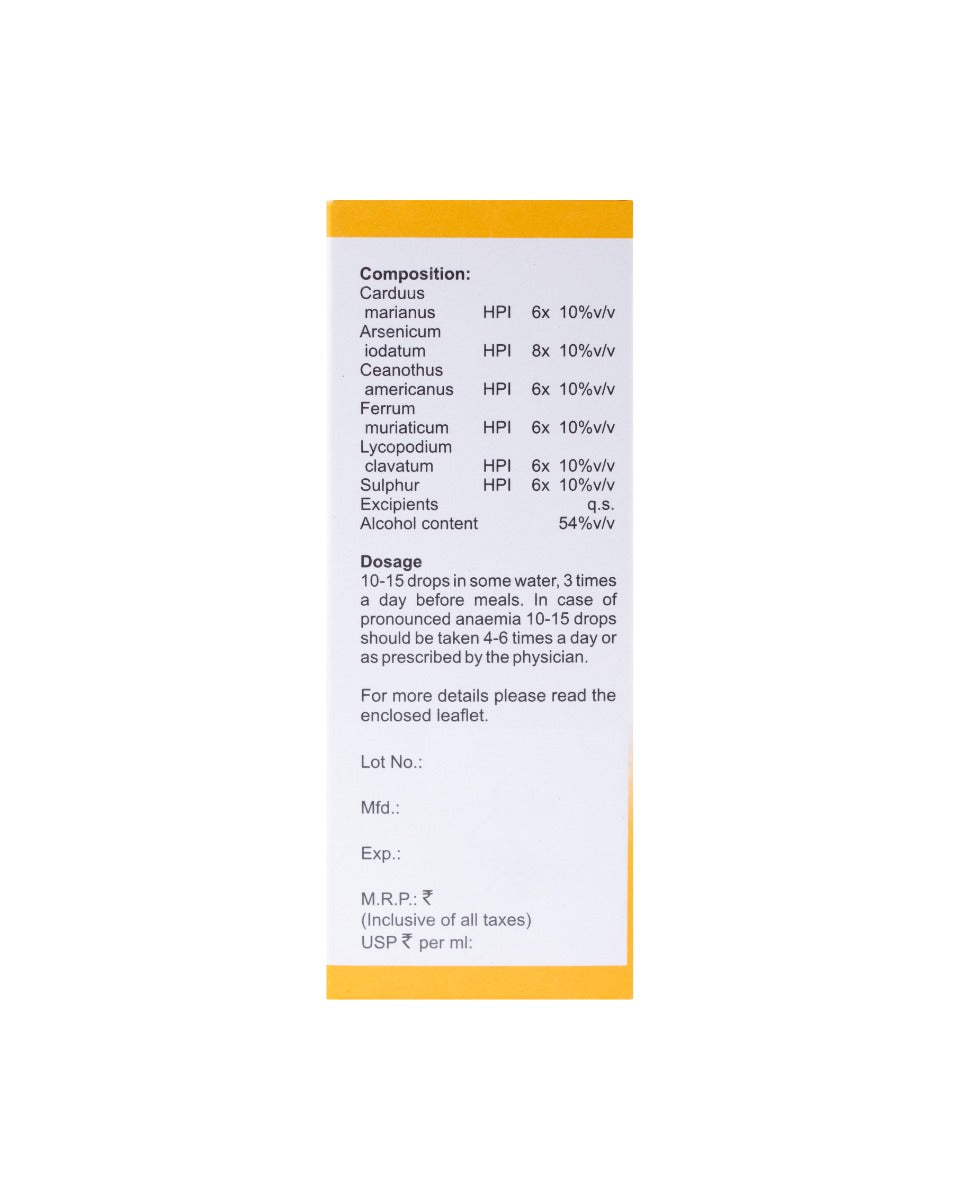 Composition: Carduus marianus 6x, Arsenicum iodatum 8x, Ceanothus Americana 6x, Ferrum muriaticum 6x, Lycopodium clavatum 6x, Sulphur 6x.