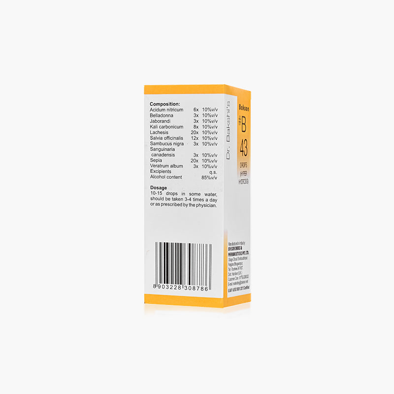 Composition: Acidum nitricum 6x, Belladonna 3x, Jaborandi 3x, Kali carbonicum 8x, Lachesis 20x, Salvia officinalis 12x, Sambucus nigra 3x, Sanguinaria Canadensis 3x, Sepia 20x, Veratrum album 3x.