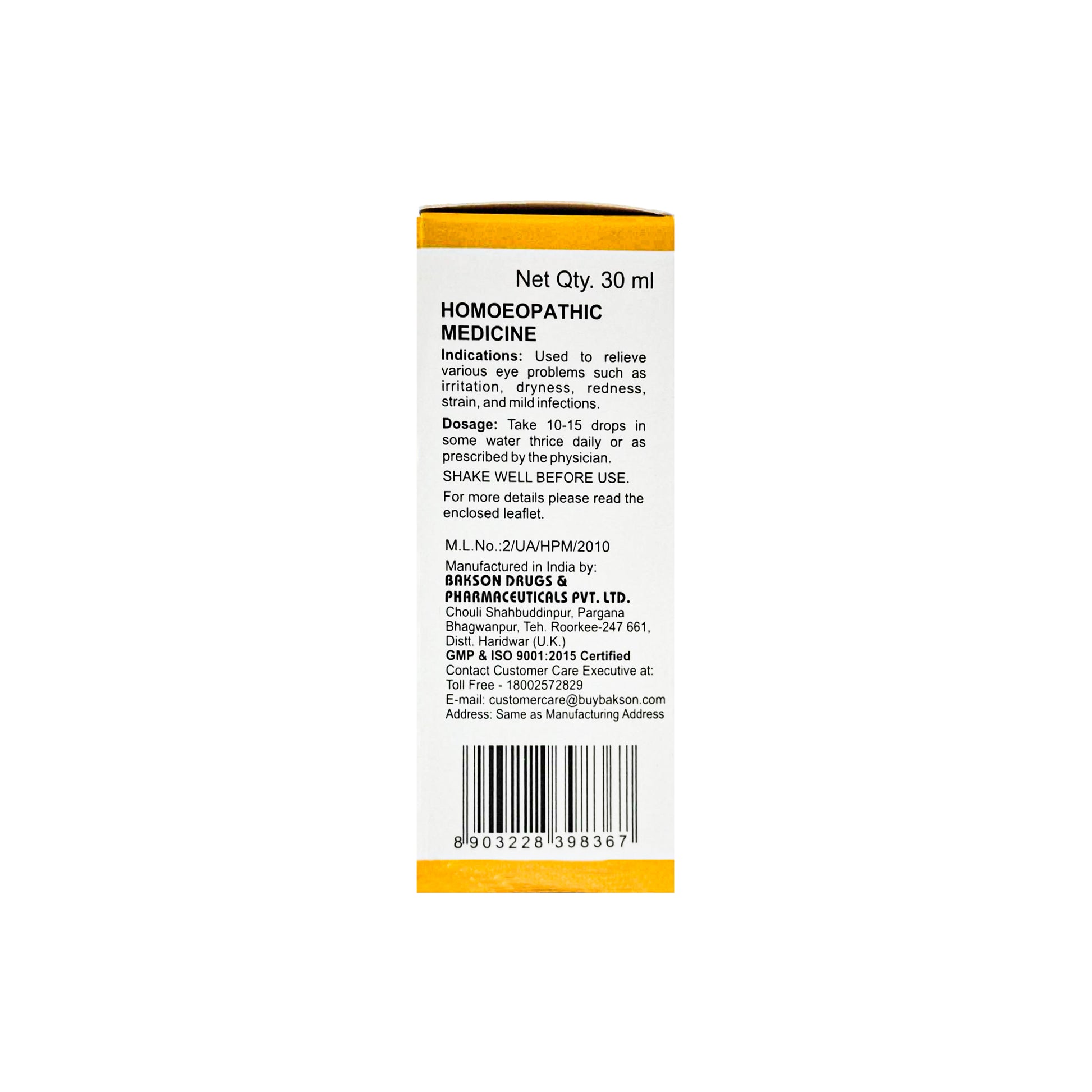 Manufactured in India by: Bakson Drugs and Pharmaceuticals Pvt. Ltd. Chouli Shahbuddinpur, Pargana Bhagwanpur, The. Roorkee-247661, Distt Haridwar, UK, India ,Customer care executive Mail id and contact details-customercare@buybakson.com, 18002572829