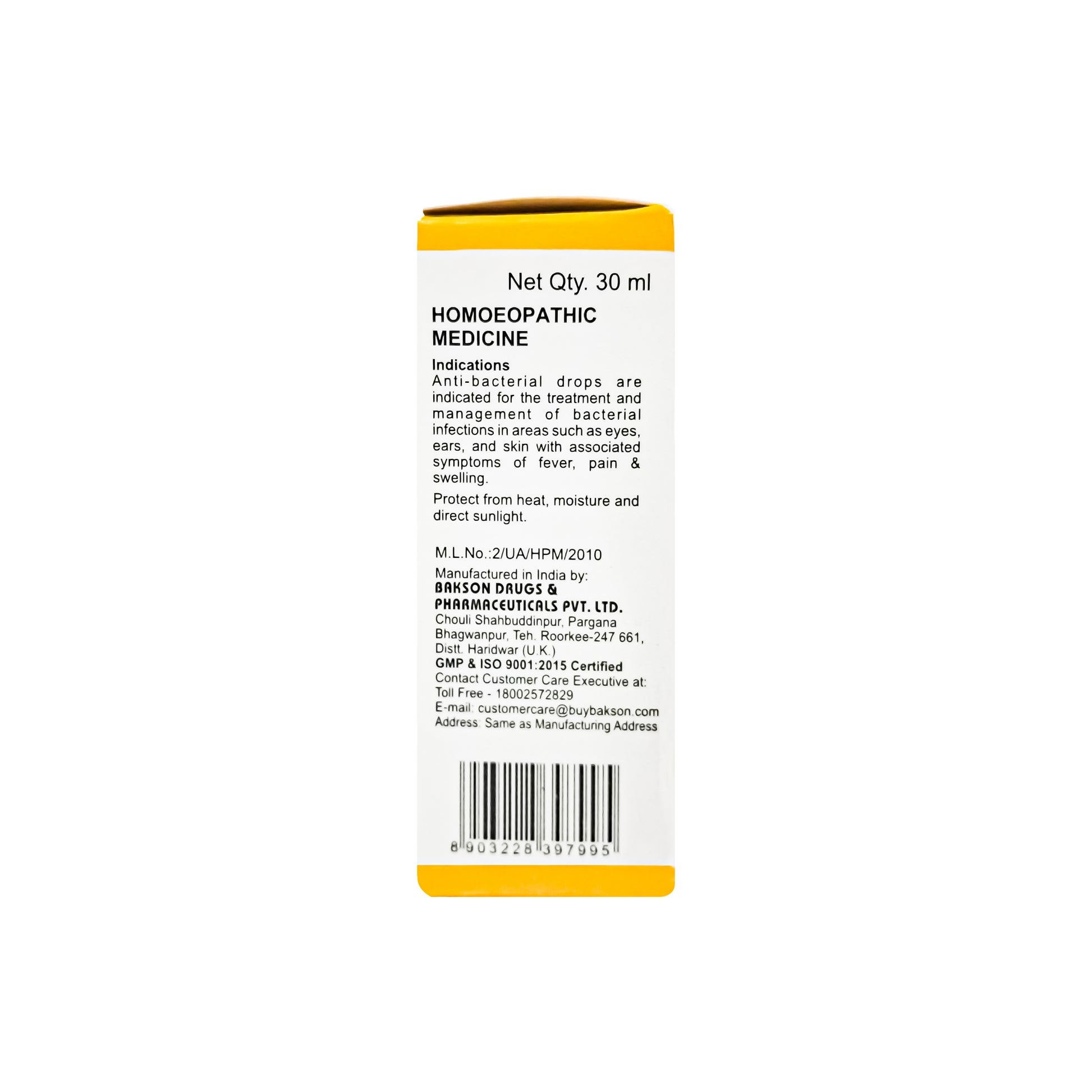 Manufactured in India by: Bakson Drugs and Pharmaceuticals Pvt. Ltd. Chouli Shahbuddinpur, Pargana Bhagwanpur, The. Roorkee-247661, Distt Haridwar, UK, India ,Customer care executive Mail id and contact details-customercare@buybakson.com, 18002572829