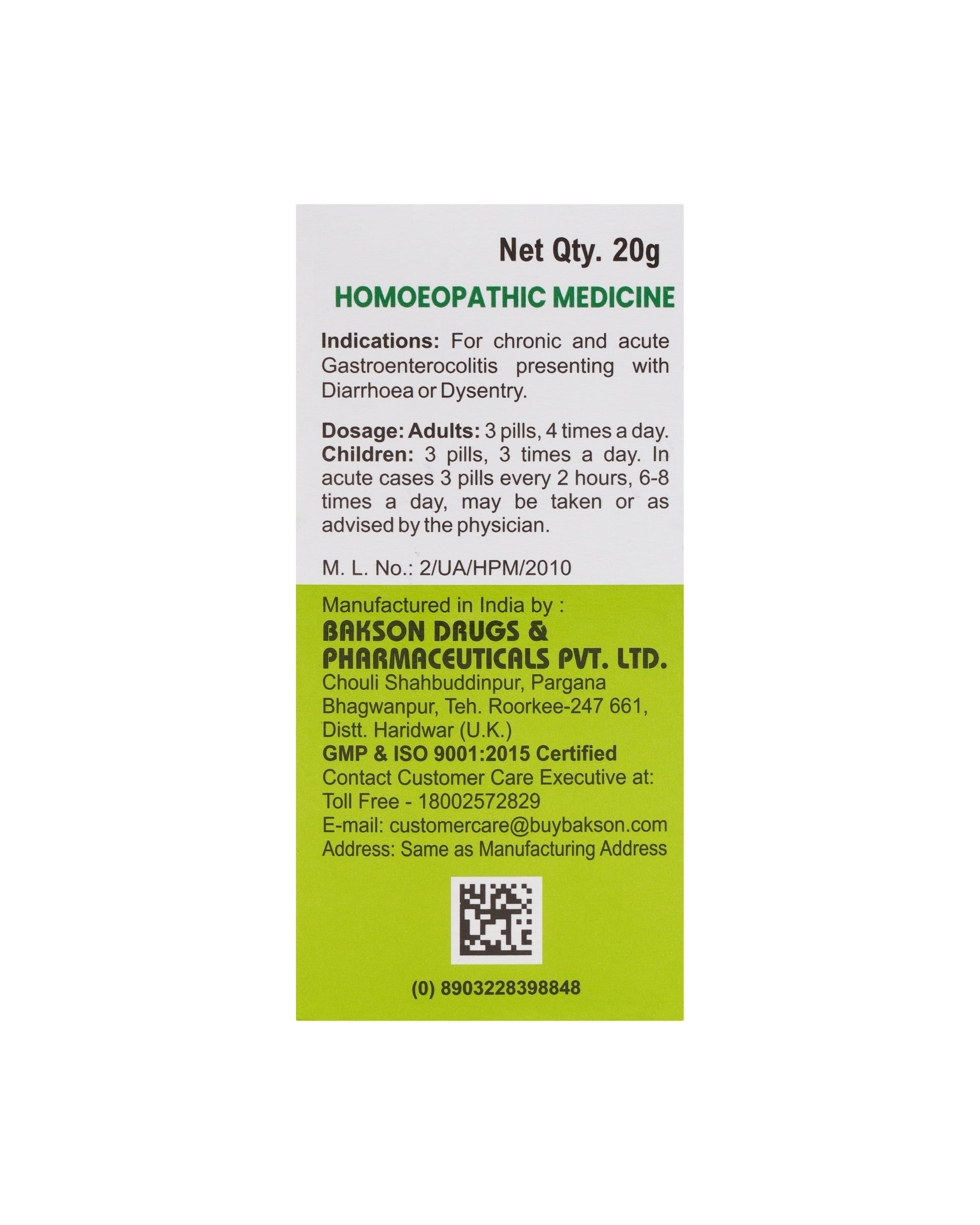 Manufactured in India by: Bakson Drugs and Pharmaceuticals Pvt. Ltd. Chouli Shahbuddinpur, Pargana Bhagwanpur, The. Roorkee-247661, Distt Haridwar, UK, India Customer care executive Mail id and contact details-customercare@buybakson.com, 18002572829