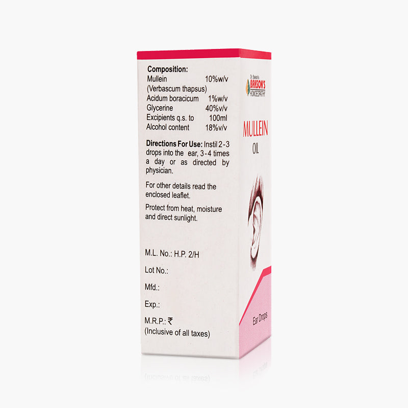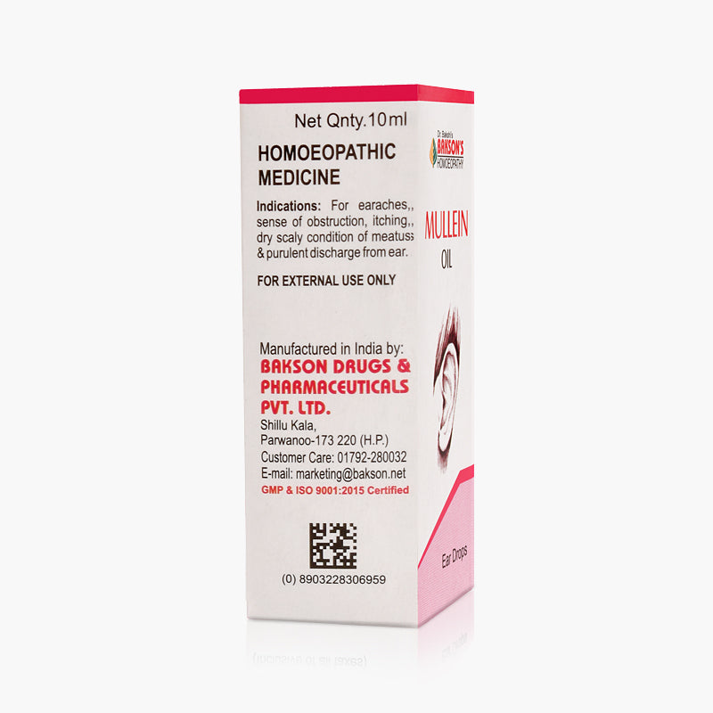 Bakson’s Homoeopathy provides Mullein Oil in Glycerine base, which softens and loosens the ear wax and has a cleaning action on the ear.