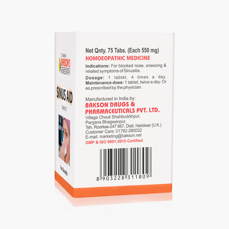 ,mst_search_weight=0,pack_size=75 Tabs,product_brand=Bakson's Homoeopathy,timershow=YesSinusitis means inflammation of a sinus. Most bouts of sinusitis are caused by an infection, but also can be caused by allergies and chemicals or particulate. The cheekbone (maxillary) sinuses are the most commonly affected.
